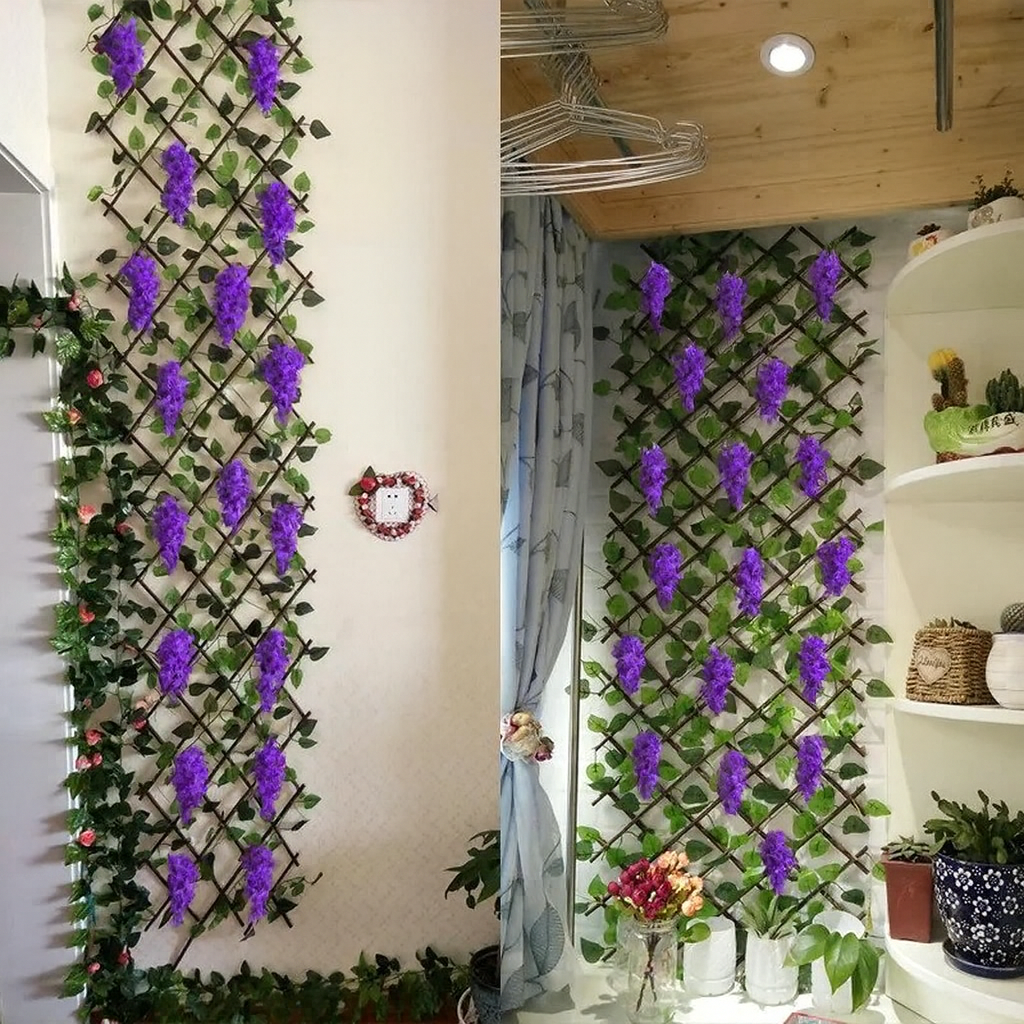 Incluye la malla con hojas. De forma opcional, puedes sumar el set de 8 flores moradas y 8 mtrs follaje lineal para más densidad y color.